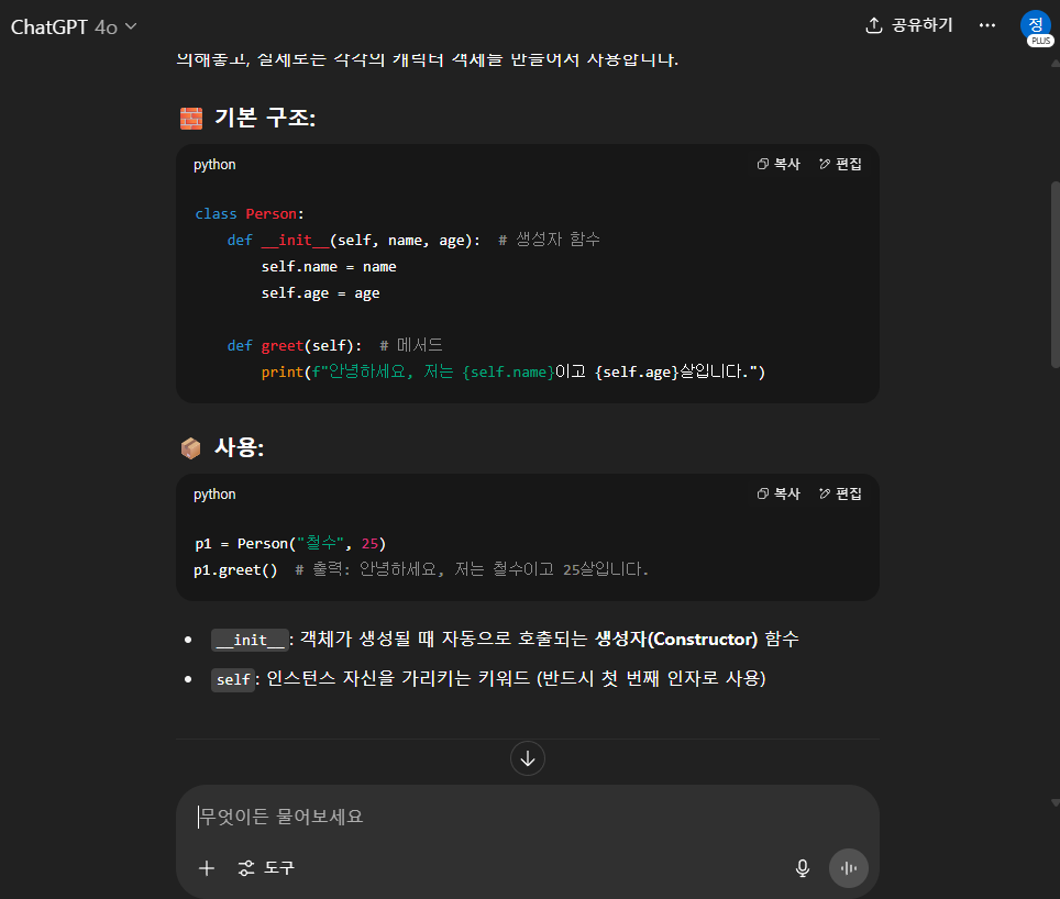 | 생성자 (__init__) | 객체 생성 시 자동 실행되는 메서드 |