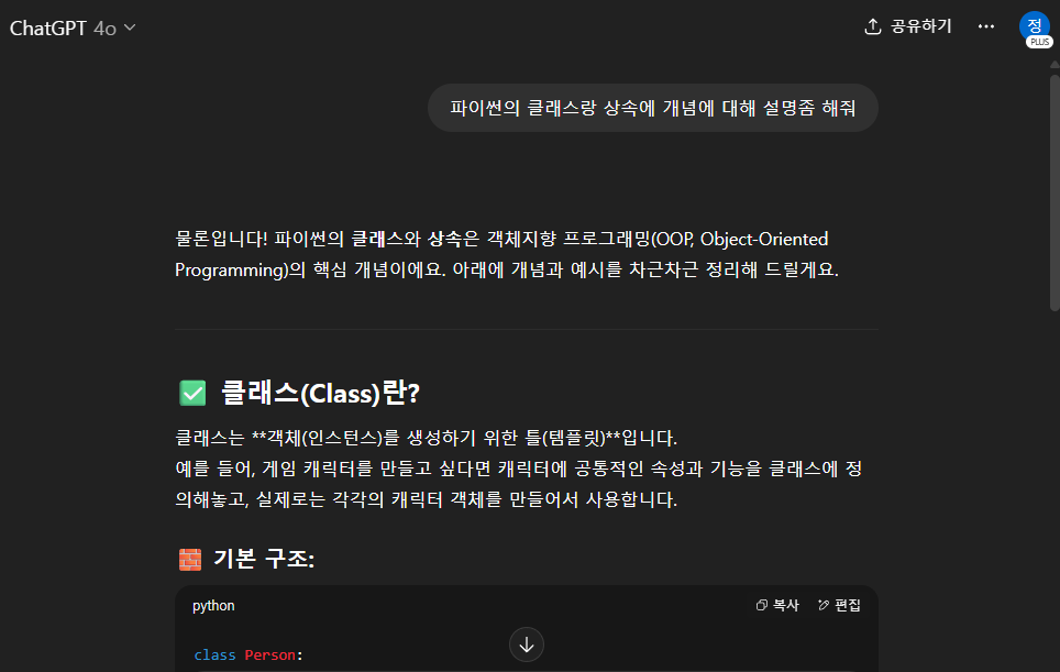 물론입니다! 파이썬의 클래스와 상속은 객체지향 프로그래밍(OOP, Object-Oriented Programming)의 핵심 개념이에요. 아래에 개념과 예시를 차근차근 정리해 드릴게요.