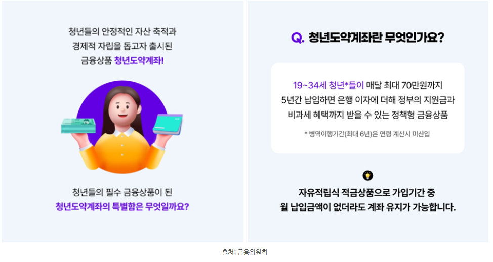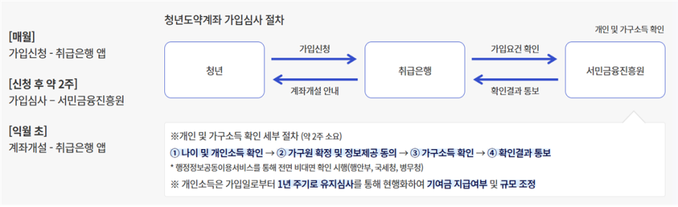 - 가입 절차: 은행 앱 → 청년도약계좌 메뉴 → 자격심사 및 소득·가구 정보 입력 → 계좌 개설 및 월 납입액 설정.
