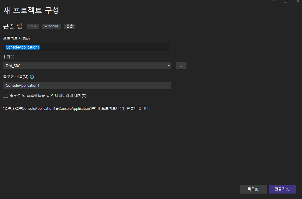 프로젝트 이름 및 위치 설정 후 만들기 클릭