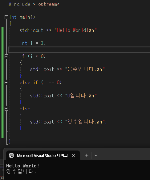 i는 양수 3이므로, 해당 조건문 실행 시 "양수입니다."가 출력됨을 알 수 있다.