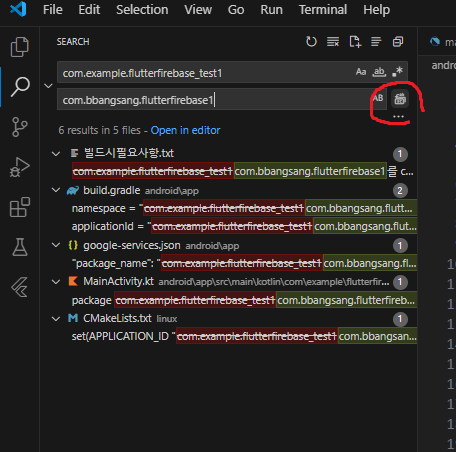 이제 다음과같이 플러터 프로젝트 안에 있는 모든 com.example.flutterfirebase_test1 이 부분을 전부 파이어베이스 콘솔에 등록되있는 패키지명(com.bbangsang.flutterfirebase1)으로 바꿔줍니다.