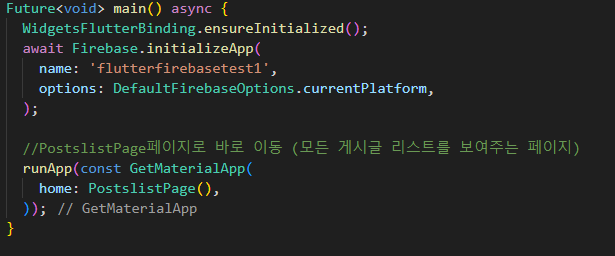 메인함수에서 데이터베이스에 들어있는 모든 글들을 가져와 리스트형태로 보여주는 PostslistPage 로 리디렉션합니다.