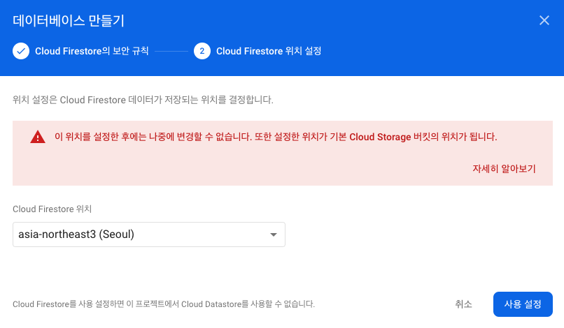 Cloud Firestore 위치는 연동되는 앱이 실행될 국가의 도시를 선택합니다.