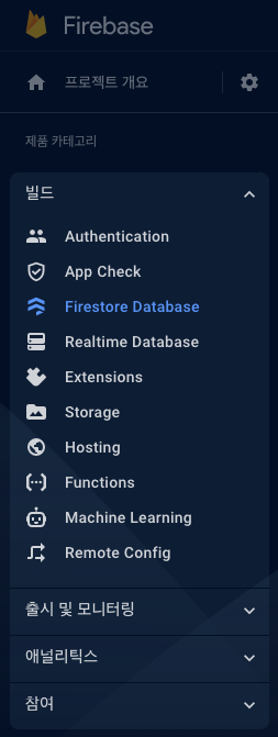 생성한 파이어베이스 프로젝트로 이동 후 왼쪽 창에서 빌드 탭을 선택하고 Firesotre Database를 클릭합니다