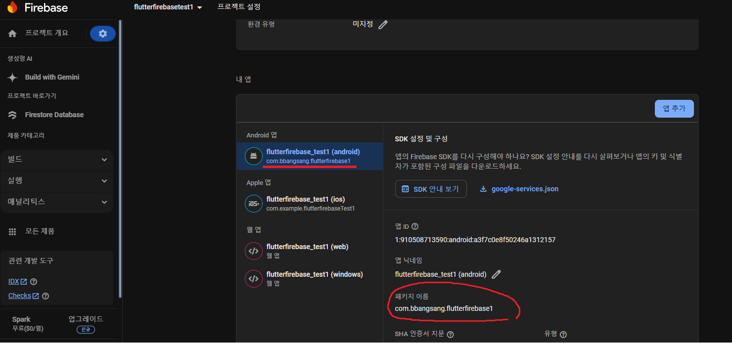 com.example.flutterfirebase_test1 이 패키지명은 플러터 프로젝트 생성 시 해당 프로젝트 폴더명으로 자동으로 생성됬던 이름입니다. 파이어베이스 콘솔로 이동하여 파이어베이스 프로젝트에 등록된 내 앱의 패키지명을 확인합니다.