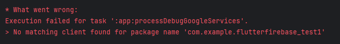 제 경우 파이어베이스에 등록한 패키지이름과 flutter 프로젝트 안에 등록된 패키지명이 일치하지 않아 다음과같은 에러가 발생하였습니다.