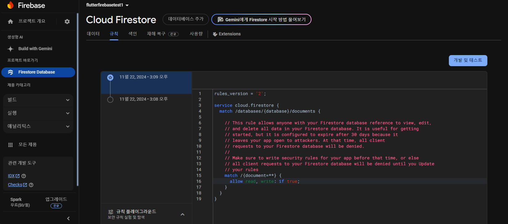 먼저 파이어베이스에서 DB기능을 담당하는 Firestore Database의 콜렉션을 생성하고 규칙을 변경해주세요.