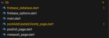플러터 프로젝트를 처음 생성하면 기본으로 생기는 main.dart파일과 전시간의 파이어베이스 연동으로 인해 생겨져있는 firebase_options.dart를 제외하고 커뮤니티 앱을 위해 작성해줘야하는 코드파일은 postlist_page.dart, viewpost_page.dart, postAddUpdateDelete_page.dart, firebase_database.dart 총 4가지입니다. 이제 각각의 코드들을 작성해보겠습니다.