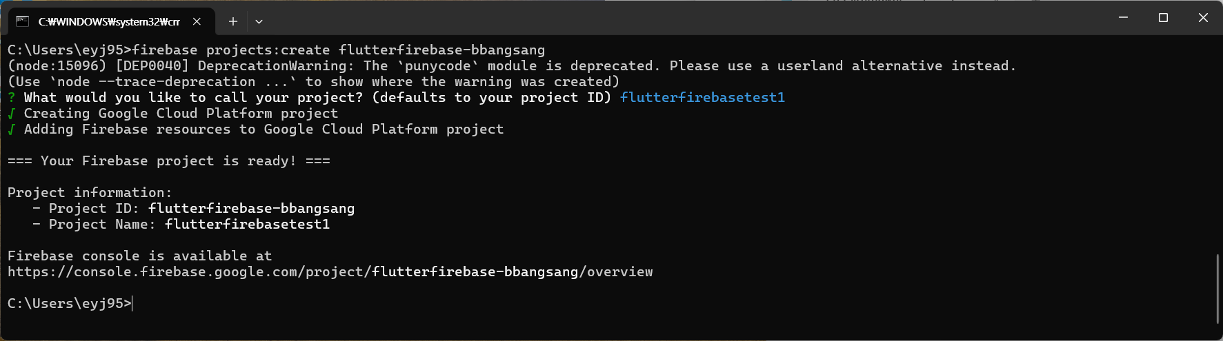 firebase projects:create flutterfirebase-bbangsang