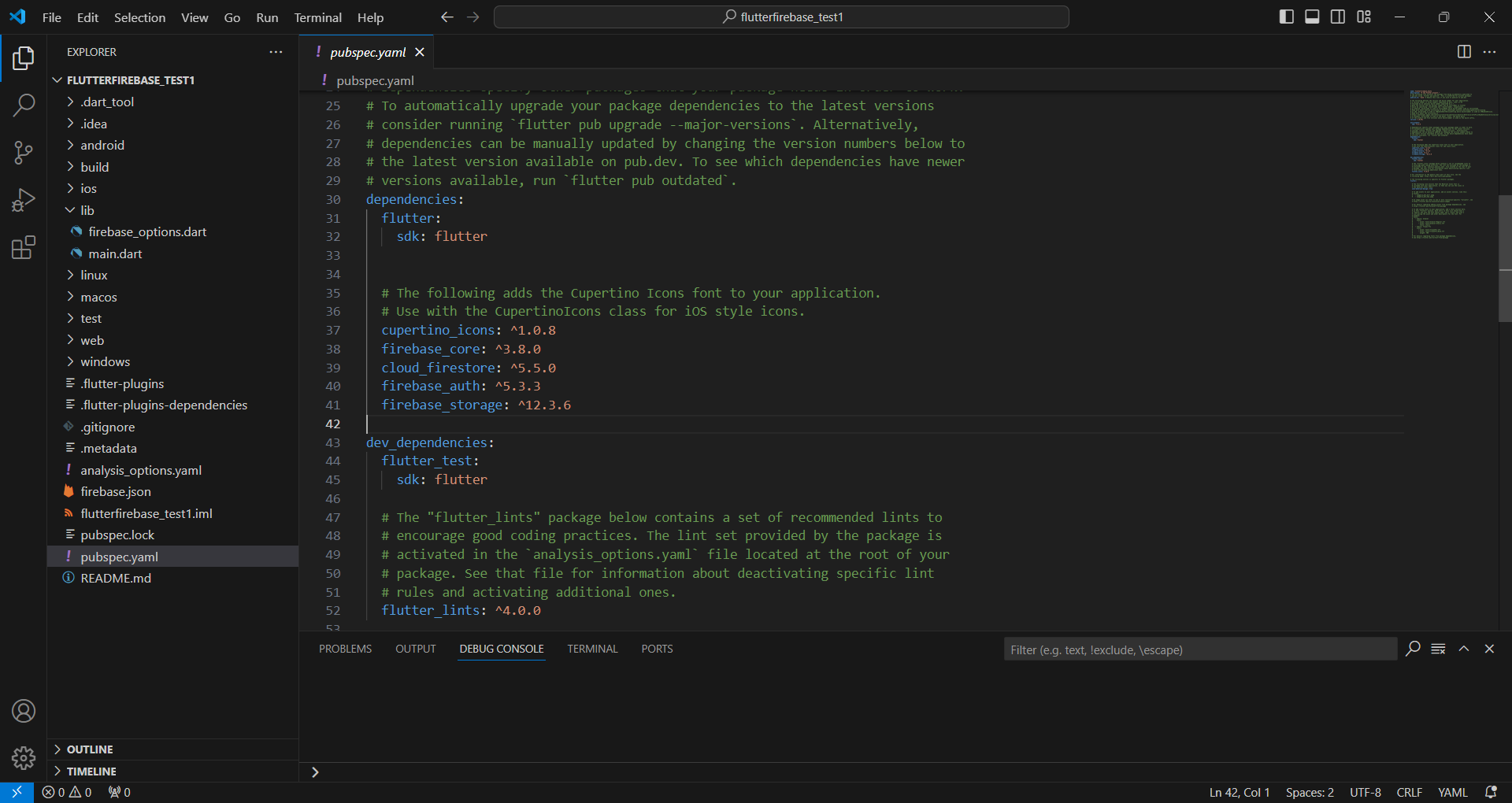 2) 해당 플러터 프로젝트 안에있는 pubspec.yaml파일에도 설치한 파이어베이스 관련 패키지들 확인가능