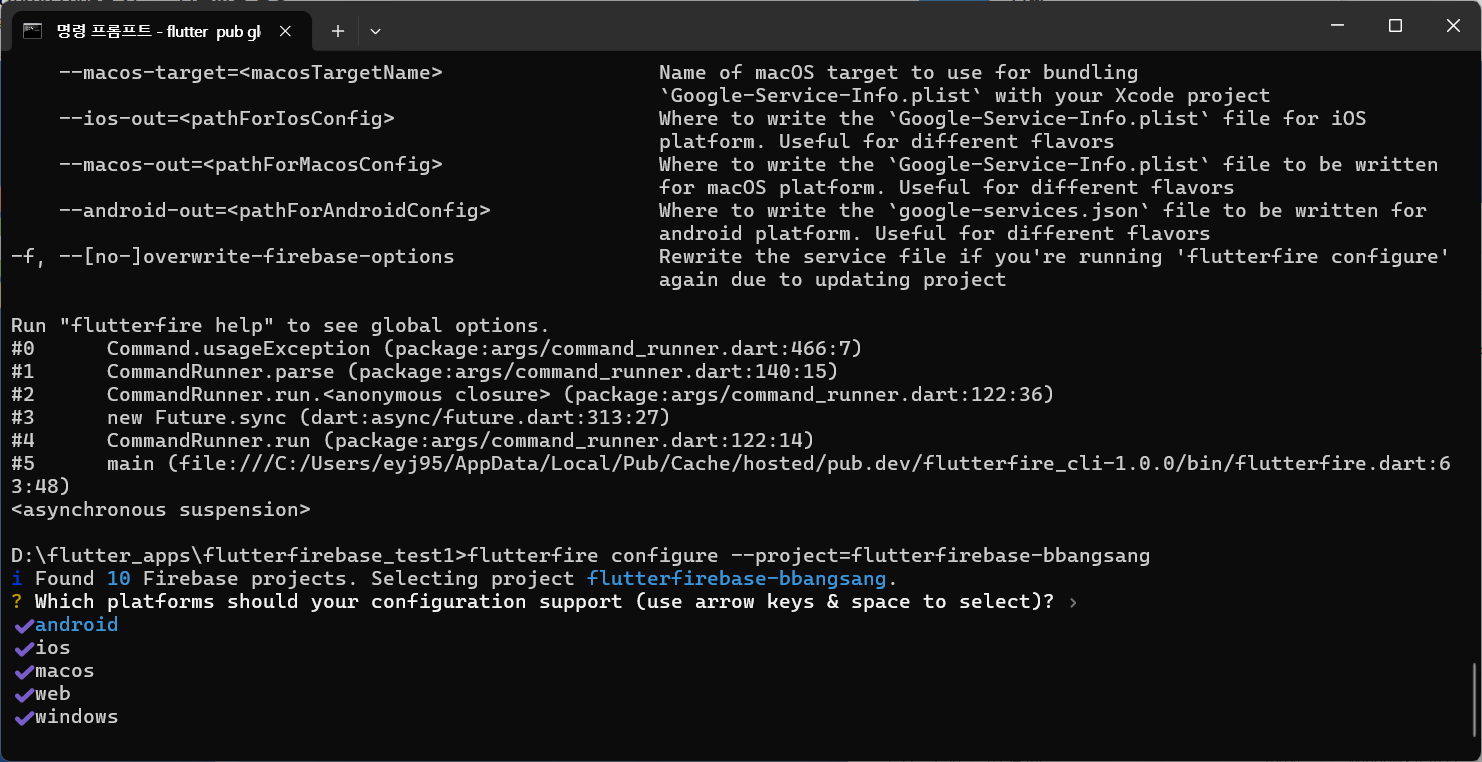 깃까지 설치했다면 다시 flutterfire configure --project=flutterfirebase-bbangsang 입력 ( flutterfirebase-bbangsang대신 여러분이 만들어준 firebase 프로젝트 이름 넣을것)