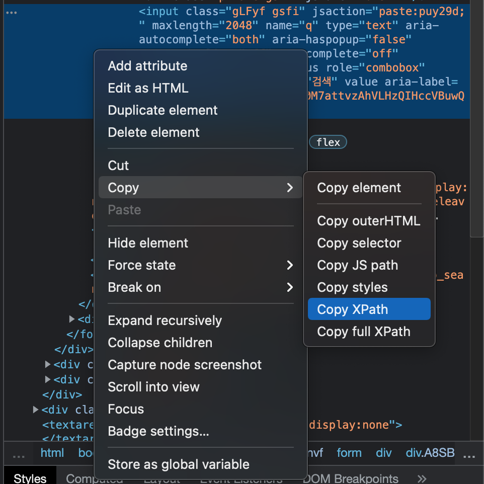ㄴ위와같이 관심있는 웹페이지에서 오른쪽버튼 클릭 후 '검사'를 눌러 개발자툴로 들어가면 해당 항목에서 오른쪽버튼>Copy에서 복사할 path정류를 클릭해줍니다